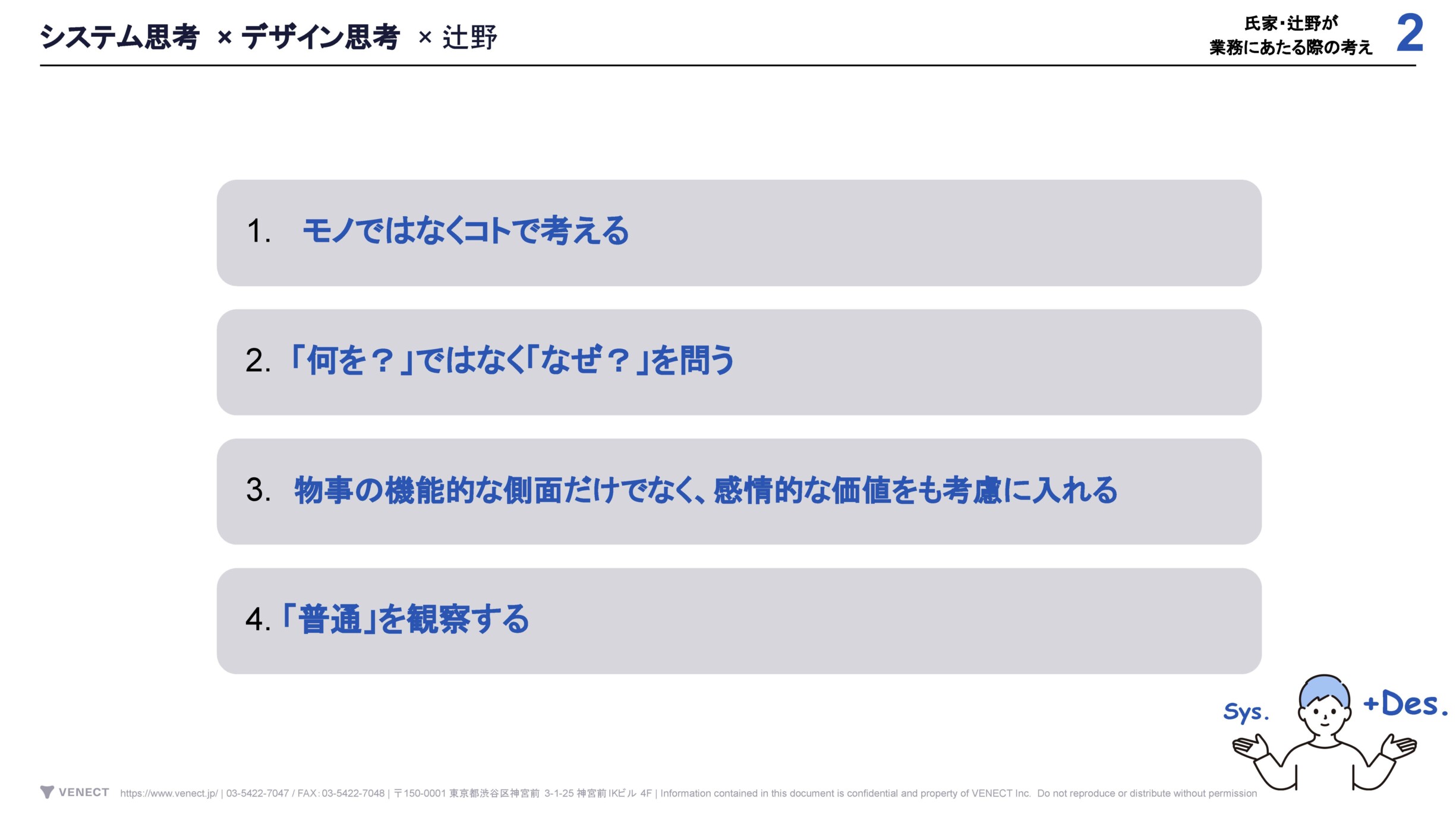 課題解決のためにモノ(アウトプット)ではなく コト(体験)に重点を置いて考えます。モノの正誤や良し悪しの判断をしやすくなったり、モノの精度や具体性が向上したりする効果があります。例えば、提案資料を作成する際は、アウトプット完成を一番の目的にするのではなく、「クライアントが共感・納得して意思決定をするまでのストーリーを作る」と体験から考えていくと良いでしょう。