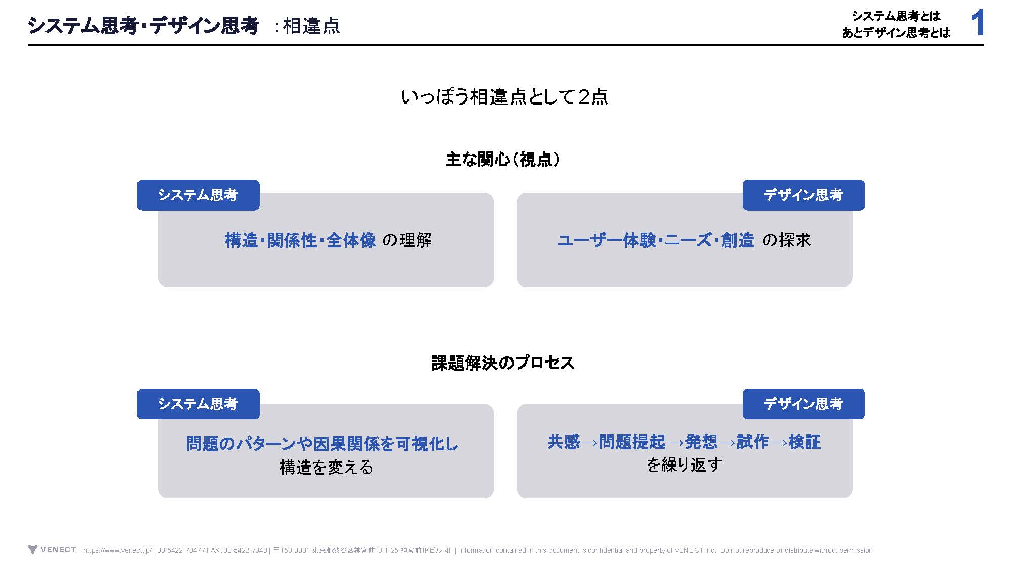 一方、相違点としては「主な関心(視点)」と「課題解決のプロセス」の2つが挙げられています。業務に思考法を活かす際は、それぞれの特徴と相違点を踏まえ、課題解決に適切な方を選択する必要があります。